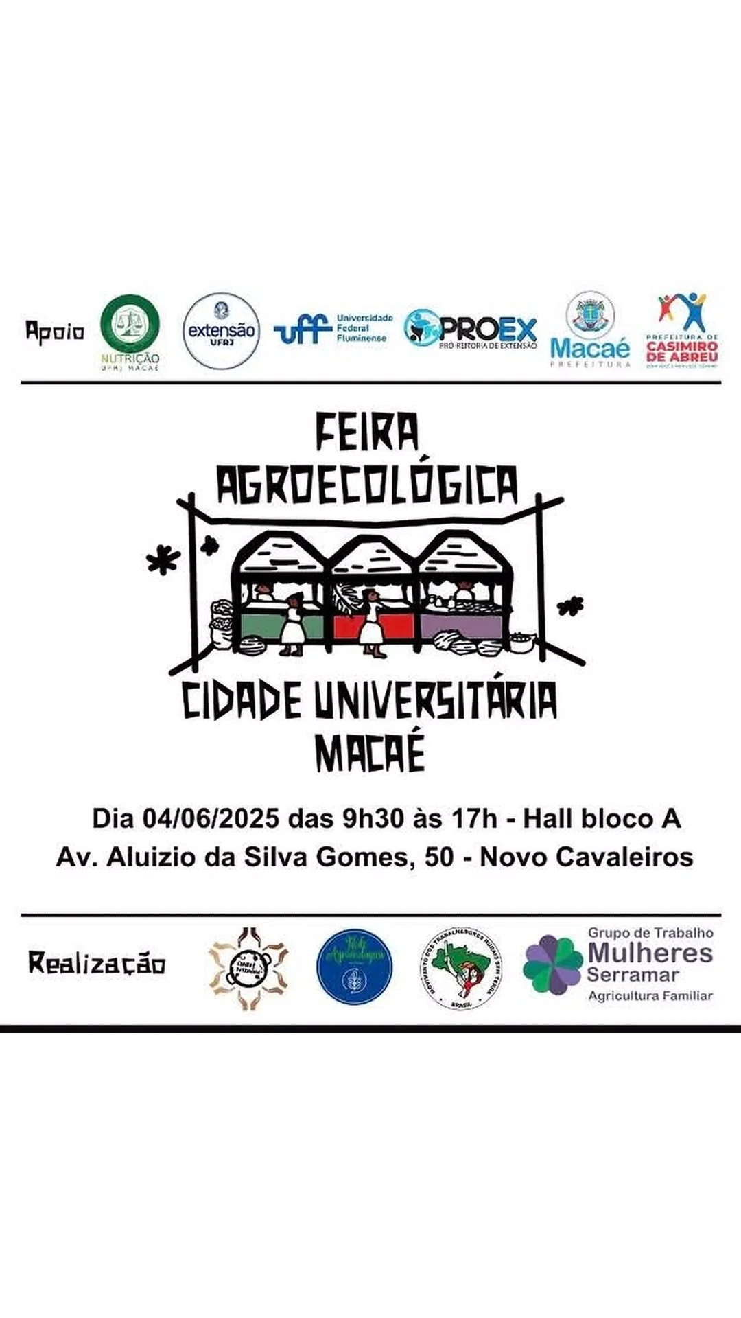 Com apoio da UFRJ, UFF, Prefeitura de Macaé e Casimiro de Abreu, a feira também contará com atividades educativas. A realização é de coletivos locais, como o Grupo de Trabalho Mulheres Serramar. A entrada é gratuita e aberta ao público.