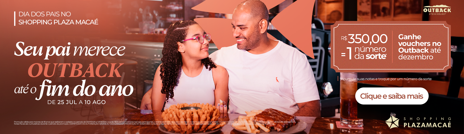 O Shopping Plaza Macaé lançou sua campanha de Dia dos Pais, com início na última quinta-feira (25). A ação vai sortear vouchers de consumação no restaurante Outback, exclusivo da unidade local. A promoção busca incentivar as vendas e celebrar a data com experiências gastronômicas em família.