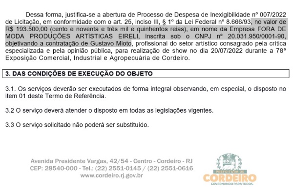 Os shows foram contratados pela prefeitura de Cordeiro com dispensa de licitação, e seus valores foram arbitrados pelo município. Veja a lista abaixo: