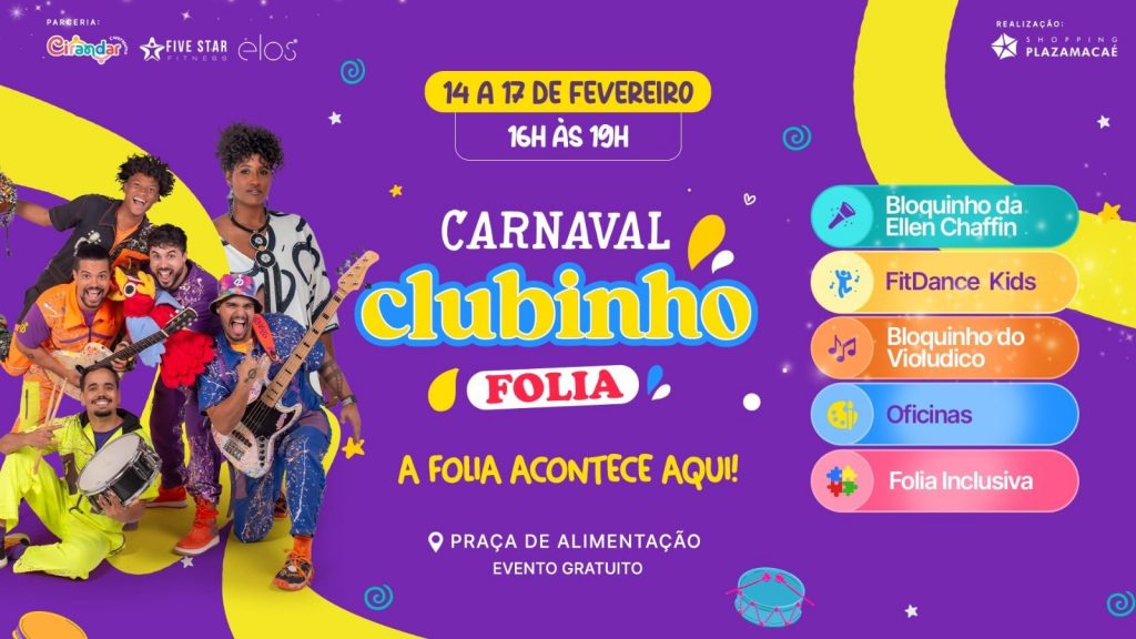 O Shopping Plaza Macaé entra no clima do Carnaval com o Clubinho Folia, um evento gratuito e recheado de atrações para o público infantil. A programação acontece de 14 a 17 de fevereiro, sempre a partir das 16h, na Praça de Alimentação, prometendo muita música, cores e diversão para toda a família.