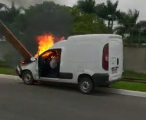 Após colidir em poste, chamas se alastram e causa apreensão aos motoristas que trafegavam na Rodovia Norte-Sul – Eu, leitor, o repórter