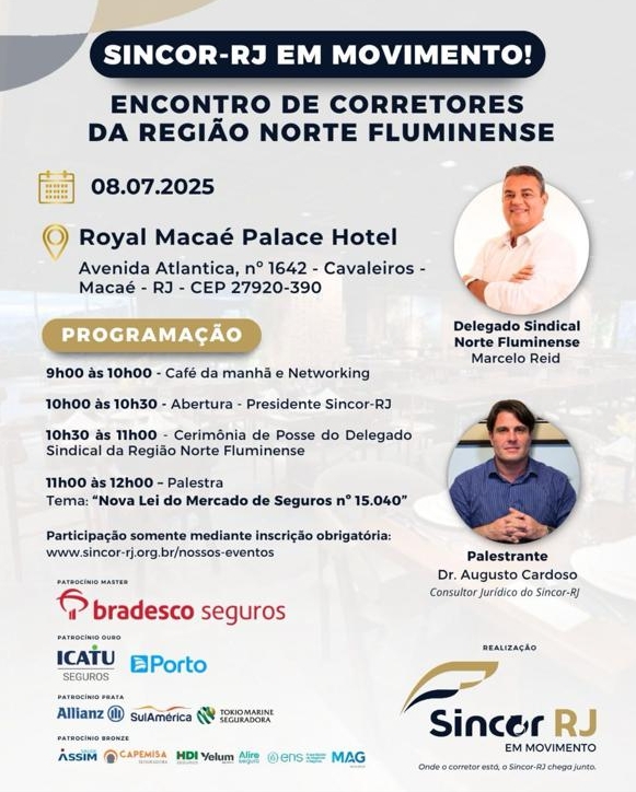 Tendo como objetivo principal o debate da nova Lei do Mercado de Seguros e a cerimônia de posse do Delegado Sindical da Região Norte Fluminense, o município de Macaé vai sediar no próximo dia 8 de julho o Encontro de Corretores de Seguros do NF.