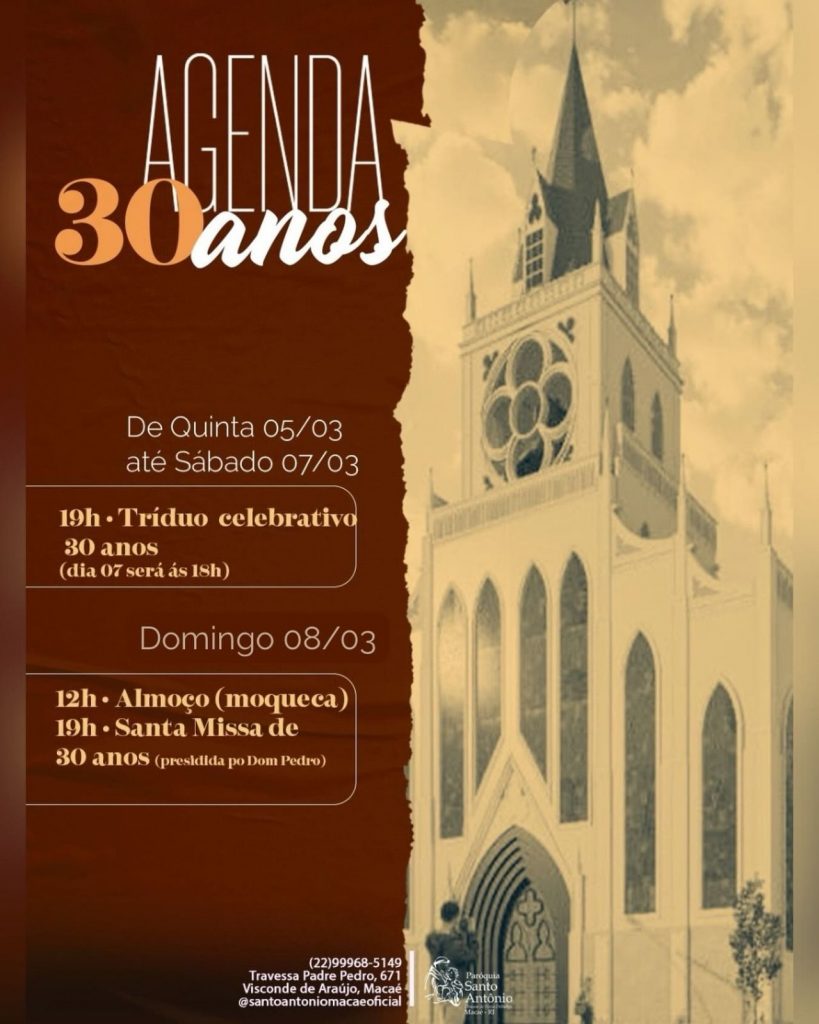 A Paróquia Santo Antônio já vive intensamente a preparação para celebrar seus 30 anos de história em Macaé, no próximo domingo, dia oito. A programação especial marca não apenas as três décadas de existência, mas também um novo capítulo: o avanço das obras da construção da nova igreja, que seguem como sinal concreto de uma fé que continua sendo construída dia após dia.