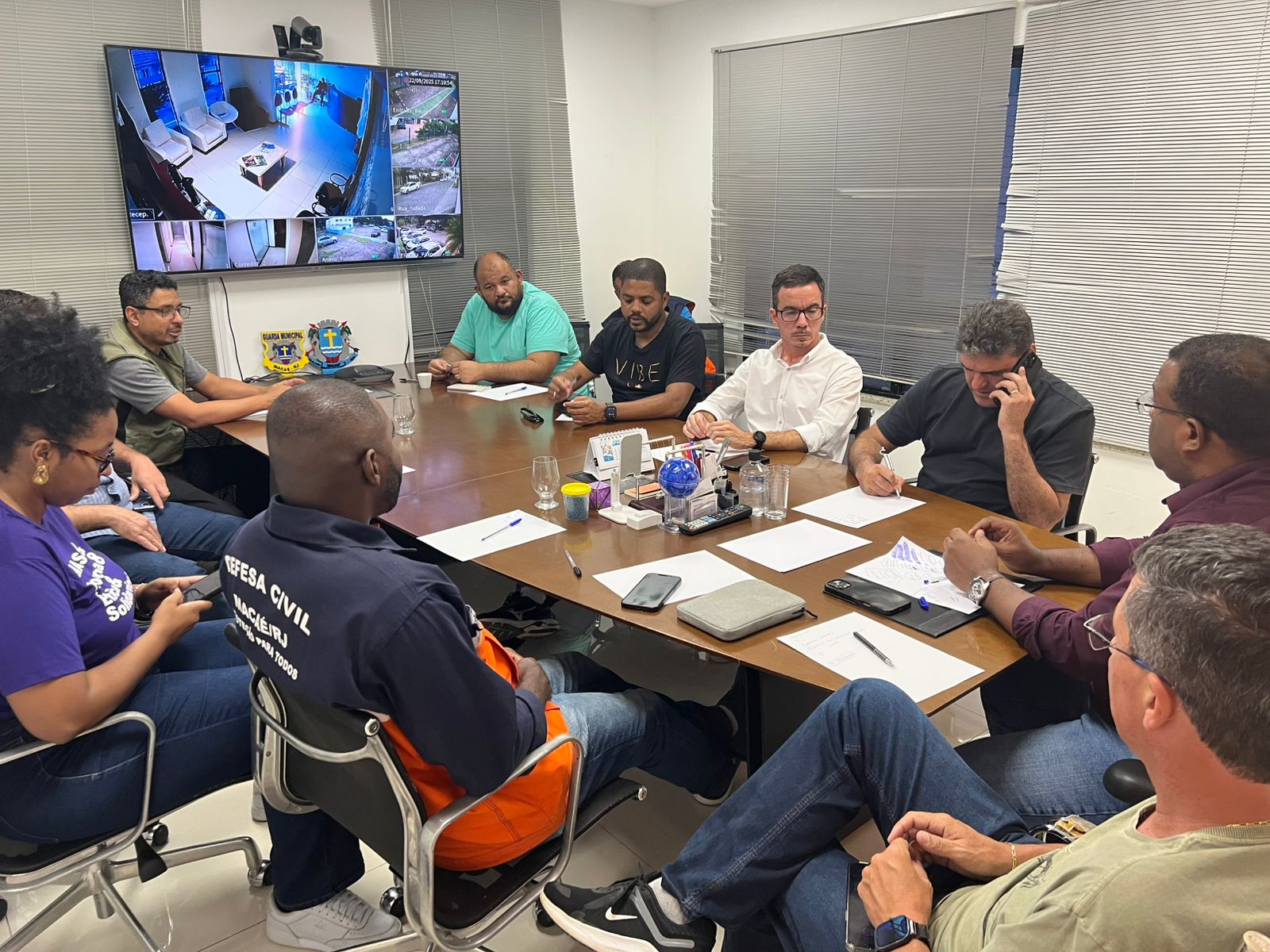 A Prefeitura de Macaé realizou, nesta segunda-feira (22), uma reunião de alinhamento para definir ações preventivas diante do aviso de pancadas de chuvas e rajadas de ventos divulgados pela Defesa Civil. O objetivo foi estabelecer o plano de contingência para o período de maior atenção, previsto entre esta segunda-feira (22) e terça-feira (23), quando a passagem de uma frente fria poderá provocar alterações significativas nas condições climáticas do município.