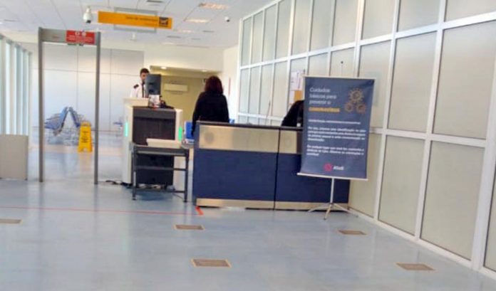 Entre as ações implementadas, está a instalação de marcadores no chão do aeroporto, onde há aglomerações de filas, e nos assentos de espera, para marcar a distância segura entre uma pessoa e outra, garantindo o distanciamento seguro de 1,5 metros.