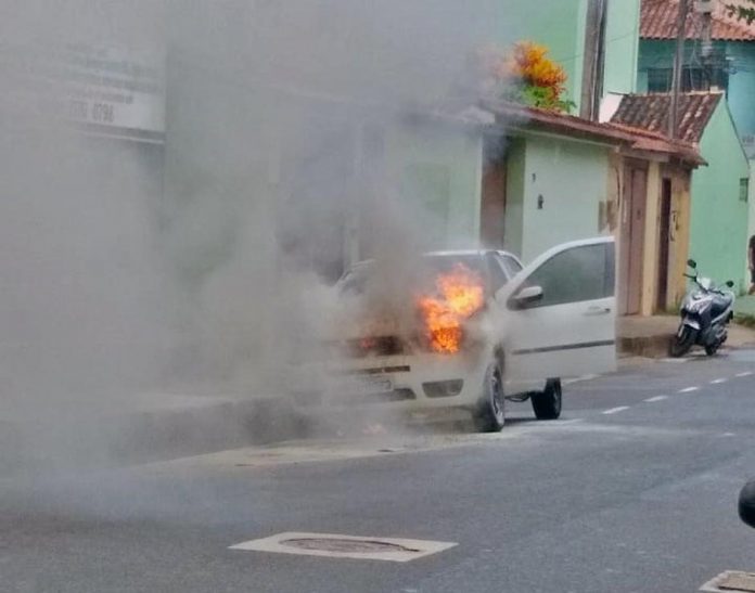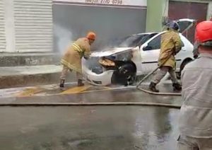 Um veículo modelo Fiat Palio, de cor branca, pegou fogo no início da tarde de quarta-feira (6), por volta das 13h40min, na Rua Jonas Mussi, ao lado de uma loja de refrigeração, no bairro Sol Y Mar, em Macaé.