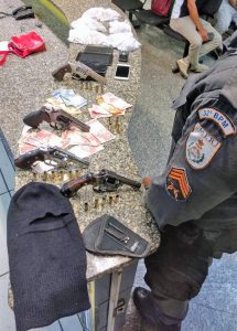 Dentro do veículo, a Polícia Militar encontrou quatro revólveres calibre 38, nove cartuchos deflagrados, 14 munições intactas, um rádio comunicador, uma touca ninja, 5 aparelhos de celular, 1 tablet, R$ 394 (em moeda), e R$ 228 ( em espécie). De acordo com a PM, os criminoso seguiam em direção ao município de Campos dos Goytacazes.
